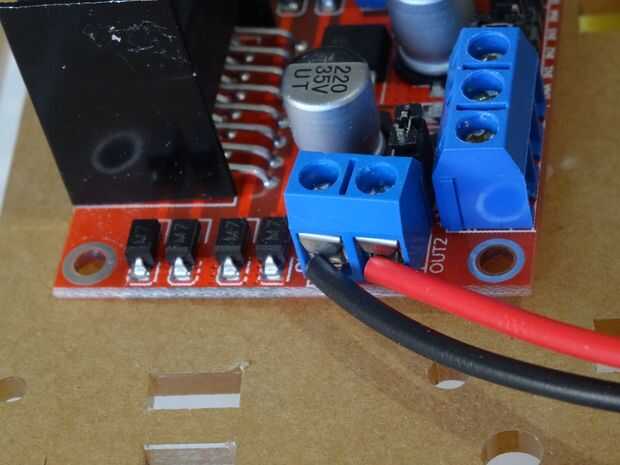1. Conecte los cables de uno de los motores a los pines OUT1 y OUT2 Control del Motor del Módulo del controlador Motor L298N (foto 1)