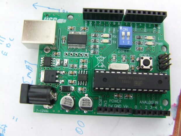 Realmente quería conseguir esta copia de Diecimila de Arduino poco Junta tardé 2 semanas para llegar por correo así que tuve que empezar rápido con mi Arduino tablero de pan así que compré un ATMEGA168 y pensó que podría conseguir funcionando sin ninguna componentes más... para mi sorpresa no funcionó y tuve que conseguir otro envío con un cristal de 16Mhz y las dos tapas de 22pf... Luego obtuve la siguiente...