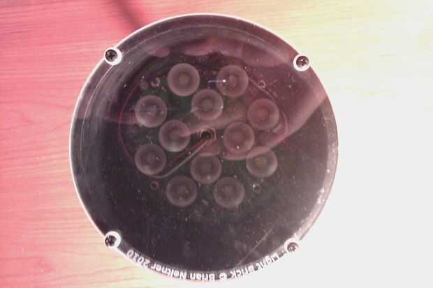 Por último, fije el protector acrílico (producido por http://ponoko.com) al otro lado del cilindro de aluminio anodizado para evitar daños en el tablero del LED. Fije mediante arandelas de plástico y 1/2" 6-32 tornillos para evitar grietas. Uso de arandelas de metal agrietará el escudo acrílico Si aprieta demasiado. Además, acrílico frost y convertido en opaco o romperse si se exponen a algunos disolventes. Antes de intentar lavar la pantalla, asegúrese de que su disolvente es compatible con el acrílico. En general, el escudo no se necesita ser muy limpio para lograr excelente claridad óptica en el mismo rayo de luz.