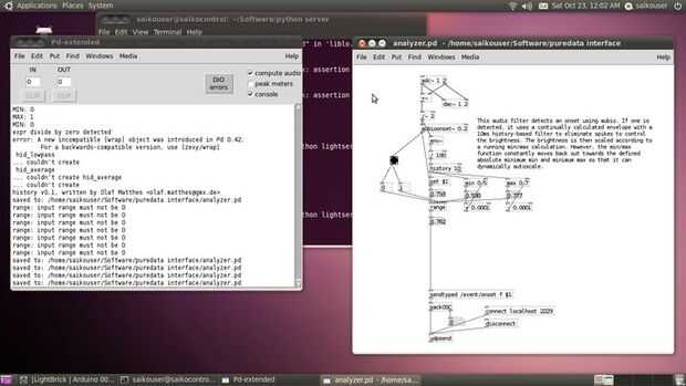 La carpeta de puredata contiene código fuente para hacer análisis de audio con puredata un servidor adjunto de python para la comunicación real con las luminarias Saiko5. Este es el software que se utiliza para hacer los videos de respuesta de la música en la página. La captura de pantalla muestra la PureData + servidor de Python se utiliza activamente para el control de la lámpara de Saiko5.