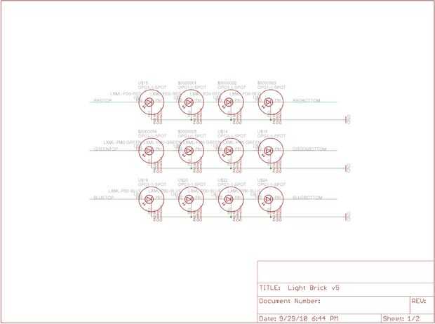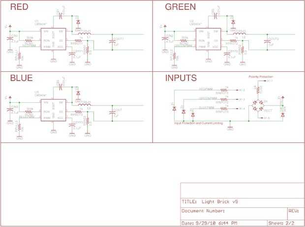 El ladrillo de luz utiliza el mismo diseño para los circuitos de potencia como el iluminador ultraluminosas. Un LM3404 de Semiconductor nacional se utiliza como base para el circuito de potencia con un convertidor del buck para proporcionar una constante 700mA identificarla independientemente del voltaje de alimentación (18-36VDC). El tablero tiene tres colores de LED: rojo, verde y azul real rebelde Luxeons de Philips Lumiled, con cuatro de cada color LED por tablero. Cada pin del control se tira a tierra para que el dispositivo por defecto "OFF" y conectado a un conector de 5 pin para control externo.