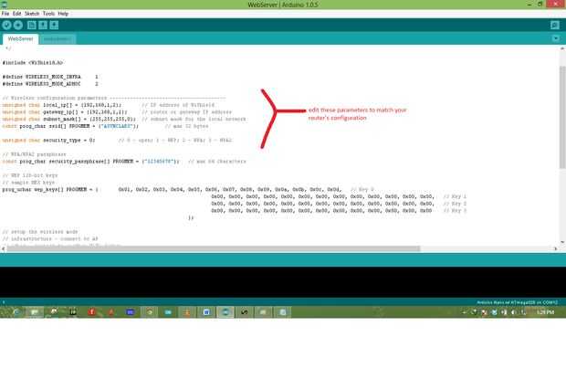 El ejemplo del servidor Web de redback no funciona automáticamente. Tienes que editar los parámetros de configuración inalámbrica para que coincida con los de tu router. Por ejemplo, estaba usando mi teléfono como router por lo que es un punto de acceso wifi portátil. Así que tuve que cambiar los parámetros de configuración inalámbrica en el servidor Web de ejemplo para: