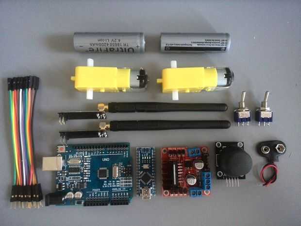 Hola,Este proyecto se realiza con 2 tableros de arduinos (UNO para el coche) y el NANO para el transmisor.También estoy usando chip de puente H para controlar motores.El transceptor es NRFL2401 que es SPI controlado por Arduino.El coche, el chasis es