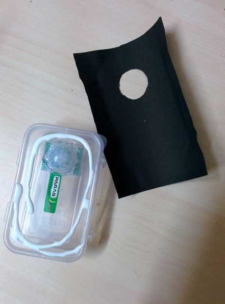 Envolver un papel de color (negro) en la superficie frontal del recinto. Hice esto para ocultar todo dentro de la caja.