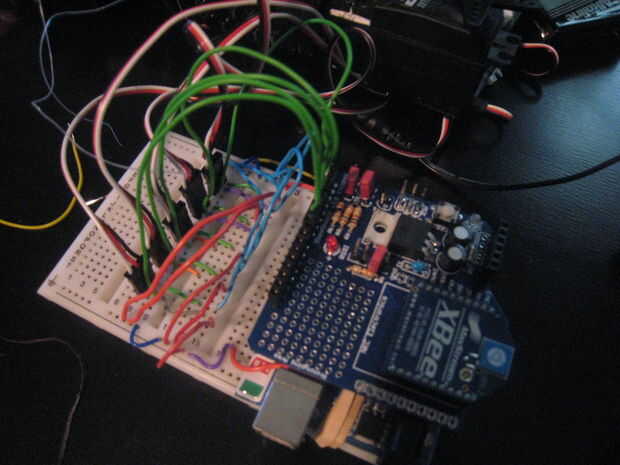 8. construir el circuito en un protoboard con sólo los servos que entrega la energía y los cables de control en la entrada Digital en el arduino