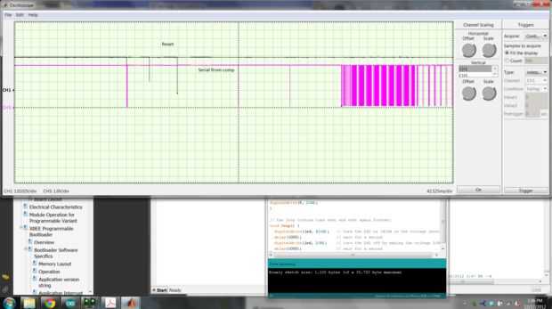* Más importante, tal vez código podría escribirse que realmente hace el Arduino blindado leer en datos en serie a interrupción y determina si el IDE está tratando de programar otra Arduino. Basado en algunos datos en serie y adquirido, parece el código para buscar una línea de 3 bytes "0x14 0x10 0x14". Por ejemplo, si el blindado recibe Arduino esta línea él restablecerá el destino Arduino. Esto le permitirá transmitir al destino Arduino desde una ventana de serie sin reseteo cada vez que transmite; Por supuesto, mientras que su transmisión no funciona con el código de restablecimiento.