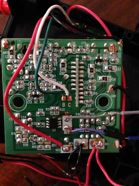Localizar los cables que conectan la placa de circuito en los motores/servos. Para este coche de RC 4-wheel-drive (Maisto Rock Crawler), cuenta con 3 motores de la C.C.; dos control de válvula reguladora (uno para el eje delantero) y otro para la espalda y un control de dirección (en el eje delantero). Nos vemos que 4 hilos conducen al frente (uno negro y uno rojo - para acelerador, uno morado y uno gris - para el volante). 2 cables llevan a la espalda (otra vez uno negro y uno rojo). Puesto que todos los componentes eléctricos estén fijados simplemente podemos usar controlador de stock de la radio del coche para probar los voltajes. Con la mano en el acelerador, probe la placa de circuito y registre los voltajes necesarios para el funcionamiento de los motores. Lo mismo para el volante.