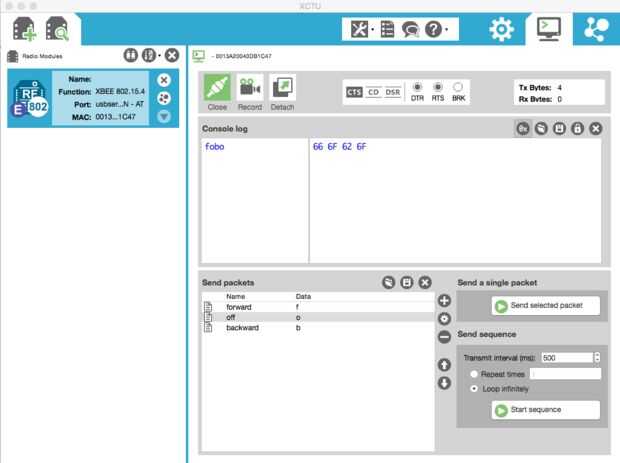 Con un XBee conectado a nuestra Asamblea y uno conectado al ordenador (mediante el adaptador de mini usb) ahora podemos probar que el XBees está comunicando correctamente. Este bosquejo de la prueba (cargado en el Arduino) debe encender el acelerador hacia delante cuando lee Arduino XBee una "f" en su serie del terminal, al revés cuando a "b" es leer y cuando está un "o" leer. Directamente podemos acceder a terminal de serie de nuestro XBee con él enchufado en el ordenador. En primer lugar debe abrir XCTU y en la esquina superior izquierda, haga clic en el icono "Dispositivos de Radio por descubrir". Una vez seleccionado y agregado, se debe ver en el lado izquierdo del programa. Haga clic en el dispositivo y su información debe aparecer a la derecha. Ahora podemos Pulse en el icono terminal (en la esquina superior derecha) para "Interruptor para modo de trabajo de consola". Ahora, haga clic en "Abrir" para abrir la conexión en serie al módulo de radio; Esto nos permite ahora añadir y enviar un único paquete de información (en nuestro caso "f", "b" y "o").