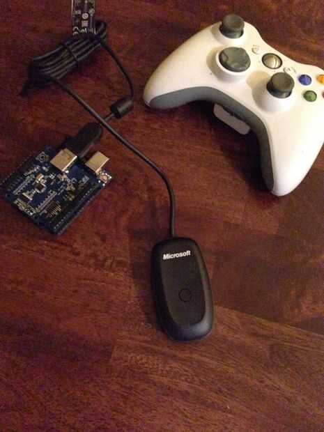 Ahora que tenemos nuestra comunicación XBees podemos movernos para interpretar la entrada de un controlador de Xbox. Para ello necesitamos agarrar nuestro Arduino segundo y colocar la pantalla de host USB. Encuentra su receptor inalámbrico de Microsoft y enchúfelo en el escudo de host USB. El receptor debe parpadeando de color verde cuando se pulsa su botón.