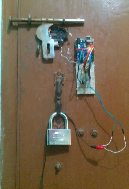 Establecer mecanismo de movimiento láser y protoboard a su puerta con pistola de pegamento caliente que se muestra arriba figura. Sin duda, dos ejes (movimiento de cierre y láser) deben estar en paralelo. Después de colocar éstos en el poder de la posición correcta utilizando el adaptador de montaje en la pared. LED de módulo bluetooth debe parpadear continuamente. Ejecute su aplicación para android (cheque paso 7 y 8) y este par de teléfono utilizando el botón de pareo si no emparejado previamente. Por primera vez te pedirá un código, uso 1234 y aceptar. Ahora Conecte su dispositivo con botón de conexión. Después de conectar, entrar contraseña conjunto a su programa de arduino (puse "arduPi", usted puede utilizar su propio) en el cuadro contraseña y haga clic cerrar el botón. La puerta se cerrará con éxito. Otra vez ingrese contraseña y abrir la puerta. ¿Puerta abierta? Si sí, que Enhorabuena! se completa con éxito su proyecto.