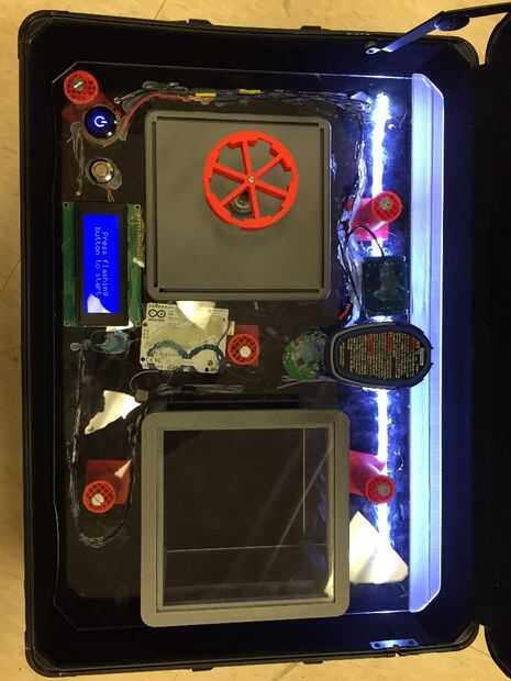 -Uno de los desafíos que enfrentó fue el tamaño del acrílico. El acrílico es 24 x 12 pulgadas, y el maletín era ligeramente más grande. Esto fue combatido usando una tira de acrílico que fue grabado en la parte superior para difundir la luz de una tira de luz LED por debajo. Todo el mundo parecía a gusta mucho este efecto.