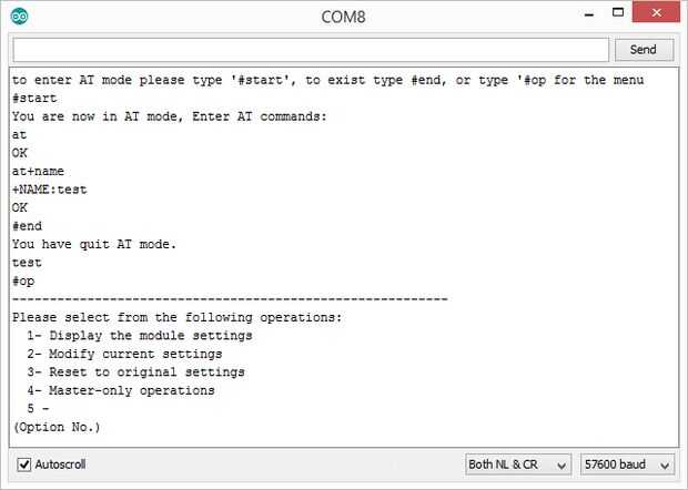 - Menú operativo: activas escribiendo '#op' en el terminal serial, esto pone el módulo en modo comando, pero en lugar de proporcionar los comandos directamente por el usuario, los comandos se emiten con un menú interactivo con operaciones predefinidas.