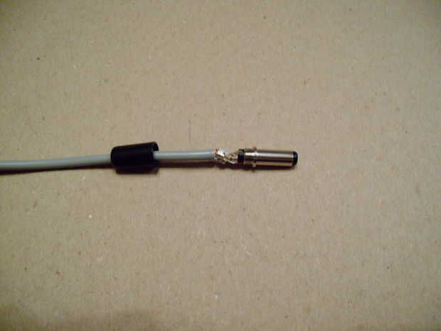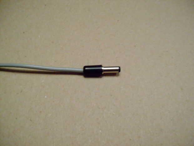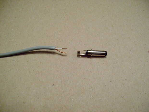 Corte seis a ocho pulgadas de alambre. Usé algunos cable audio coaxial que me ha pasado a tener. Funciona bien porque es redondo y así va muy bien a través de un orificio en la lata Altoids. Pele el aislamiento de unos 3/8" de alambre. Desenrosque el tapón negro del plata barril del enchufe eléctrico. Suelde el cable a las fichas de la clavija; Recuerde que el centro es positivo y el anillo es negativo.