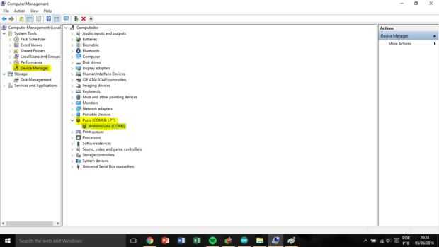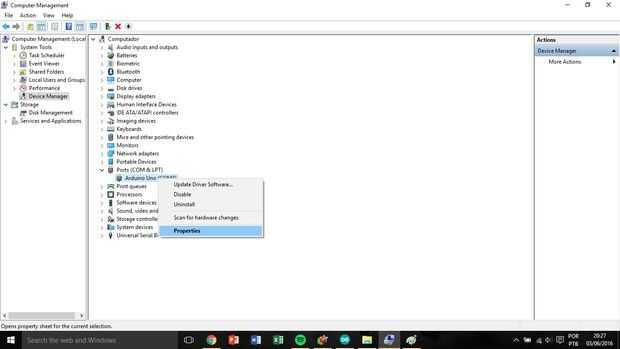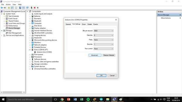 - Compruebe si su Arduino está conectado al puerto COM3 del ordenador, así que escriba "administración de equipos" en la barra de búsqueda del menú Inicio y entrar en la opción "Administrador de dispositivos" y busca la opción "Puertos (COM & LPT)", en el que se mostrará tu arduino ya que está conectado correctamente al ordenador, si está conectado a él puerto COM3 que es OK , se puede ir al siguiente paso, otra derecha clic "ARDUINO UNO" y sus "Propiedades" y entrar en el menú "configuración del puerto" y haga clic en "Avanzado" en la que será la opción "número de puerto COM" y finalmente como COM3.