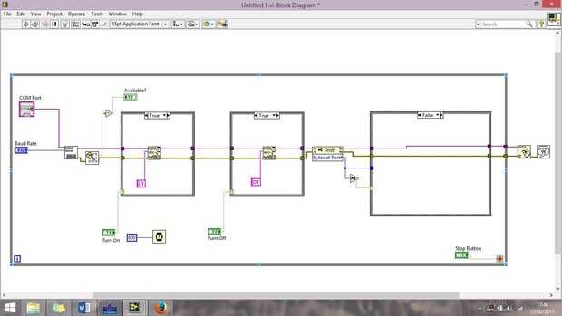 8ª conectar el botón de encender a las estructuras del primer caso, el botón apagar para el segundo caso y botón de parada a la condición de bucle mientras. (Pict.10)