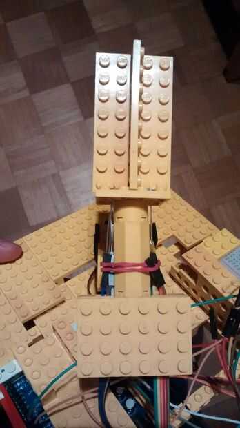 - Encontré que un plato de lego de 4 de ancho apenas pellizca perfectamente el FPV 2 ejes usado aquí;