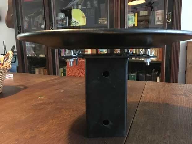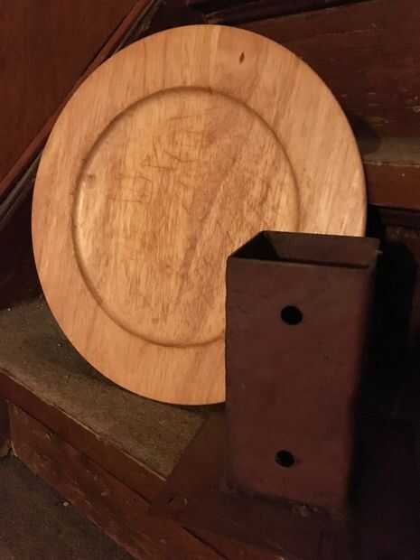Accidente feliz sobre el post de juegos que encontré en el sótano era tenía agujeros atravesando la placa ya. No hay necesidad de perforar hierro! La base tenía cuatro orificios para los tornillos, y excavamos cuatro agujeros en hundido en la placa de madera para emparejar.