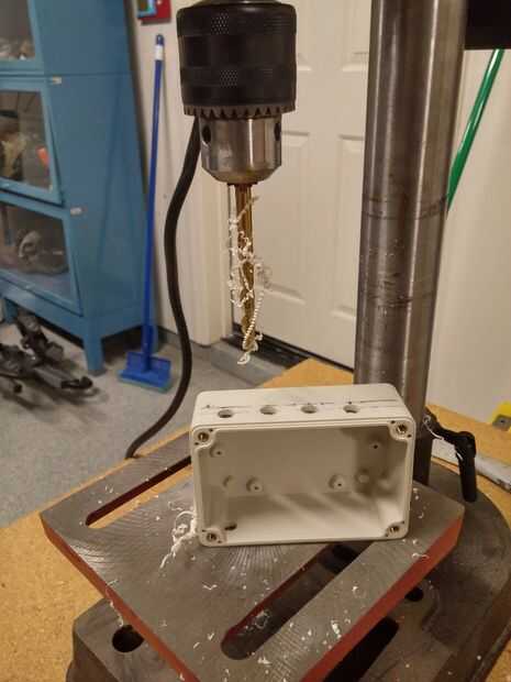 Los agujeros se perforan a través de los lados de la caja para el: ollas, botón, actividad LED y conector de alimentación. Éstos están conectados a la Junta Perma-Proto con el alambre de conexión.
