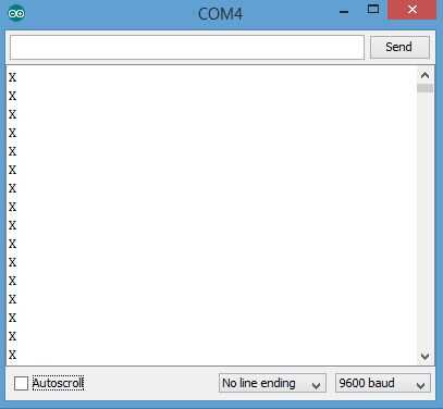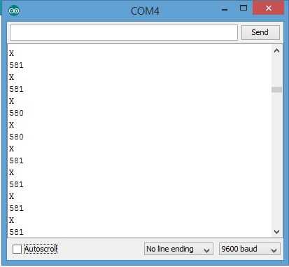 Una vez que haya subido el bosquejo a la abierta Arduino serial monitor, si todo lo que verán es X cuando el sismógrafo no se mueve entonces no necesitas cambiar nada (cuadro 3). Si se alternan números de la serie port(picture 2) cambie 581 en el if instrucción con el más grande de los dos números en el puerto serie y 580 con el más pequeño.
