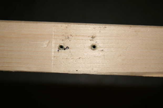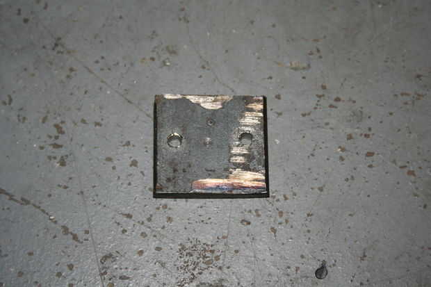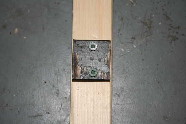 Para hacer la bisagra comienzan por perforar un agujero con un 7/64" bit tan profundamente como la parte acentuada de la broca en el centro de la pieza de metal. Luego perfore un agujero lo suficientemente grande como para un tornillo pasar aproximadamente 1/4" lejos de la orilla y repetir por el borde opuesto. Por último atornillar la placa metálica en el brazo de 4" de la parte inferior (ver última foto).