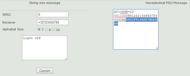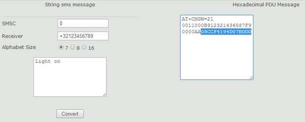 Ahora ya tenemos la primera parte de la información que queríamos (el número) pero por supuesto también quieren la parte del mensaje. Puedo ahora ya te digo 0BC8329BFD06DDDF723619. Es fácil averiguar lo que es la parte del mensaje. Introduce algo más en donde anteriormente llenaste en Hola mundo en, vea qué parte que cambia. Quiero algunos relés así que vamos a llenar de luz el control y la luz apagada, a ver la parte final del cambio de cadena PDU, la parte que cambia es la parte del mensaje! Resultado para la luz en: 08CCF4194D07BDDD. Resultado para la luz del: 09CCF4194D07BDCD66. Verás que la parte del mensaje está justo detrás de la doble A' en mi caso. Puede utilizar este método para traducir cualquier cosa que desee a la PDU y utiliza más adelante en su programa.
