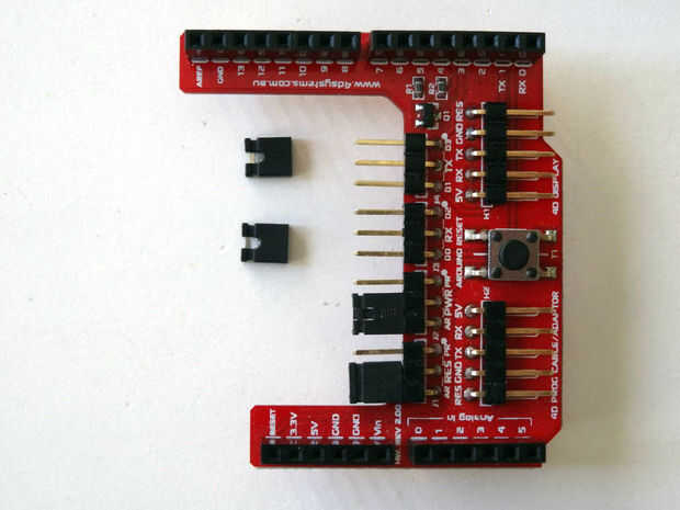 1. Retire los puentes de configuración de uno de los canales de exhibición 4D 4 D Arduino adaptador protector (el canal superior en fotos 1 y 2)