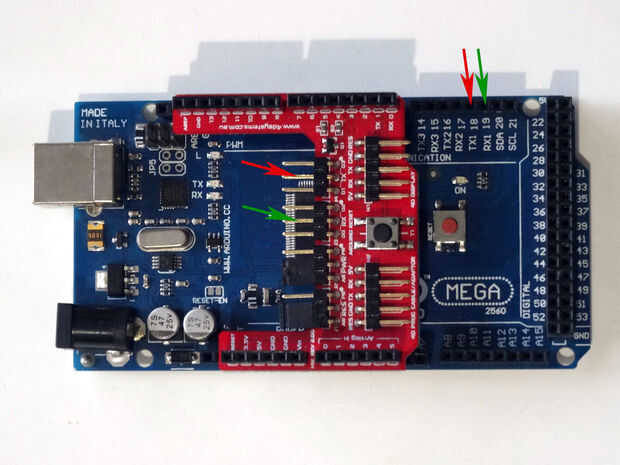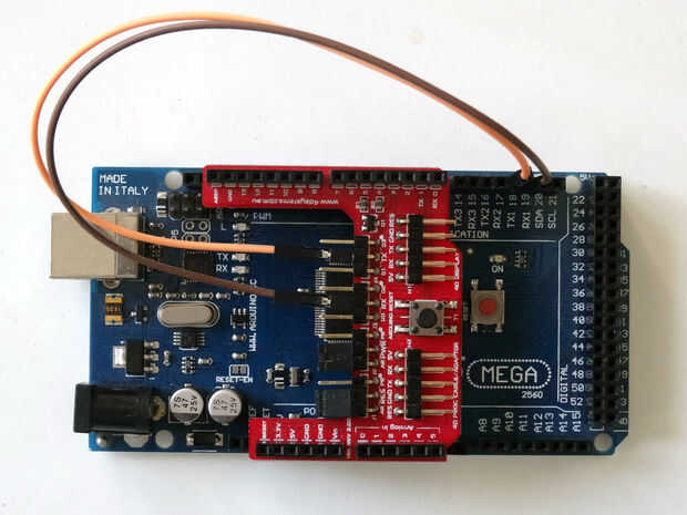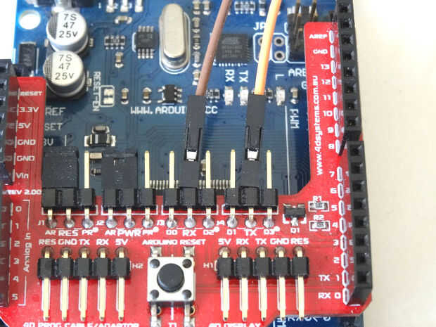 3. Conectar con un cable de puente de la Mujer-hombre (cable marrón) el pin RX (foto 4) del canal del 4 D adaptador de Arduino Shield al pin RX1 de la placa Arduino Mega (imagen 5 y 6)
