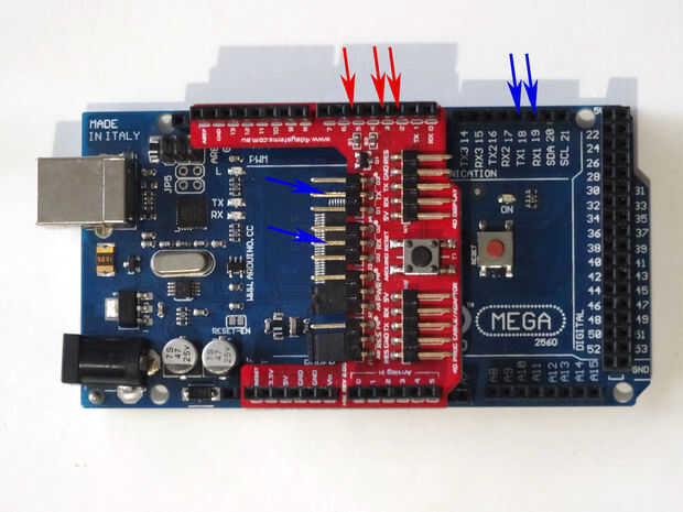 7. Cuadro 6 muestra en rojo donde están los pernos 2 Digital, Digital 3y 5 Digital de la Arduino Mega. En azul se muestran las conexiones en los pasos anteriores