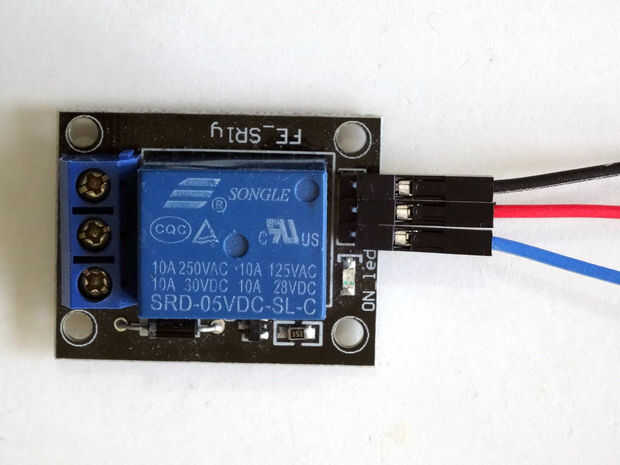 2. Conectar los extremos hembra de los cables de jumper Hembra-macho al poder (cable rojo) tierra(cable negro) y relé de Control(cable azul) del módulo de relé (foto 2)