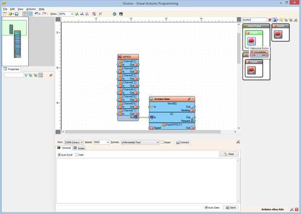 1. Tipo "botón" en la caja del filtro de la caja de herramientas del componente, seleccione el componente de "Debounce botón" (foto 1) y caer en el área de diseño (este componente reduce, el ruido debouncing cuando se presiona el botón. Para más detalles ver este Instructable)