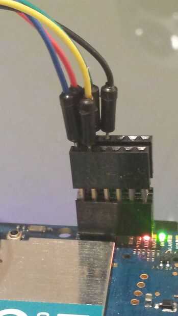 La pantalla TFT de Adafruit es un tablero de arranque con una pantalla color de 2.2". Interfaces con el Yun vía SPI. En el Arduino UNO o similar los pines SPI se ponen a disposición de los pines digitales 13, 12, 11 y en la cabecera ICSP pero Leonardo y Yun sólo están disponibles en la cabecera ICSP. Esto significa que usted necesitará un conector macho para conectar convenientemente a la pantalla. Hice uno soldando juntos dos cabeceras de Arduino como se muestra.
