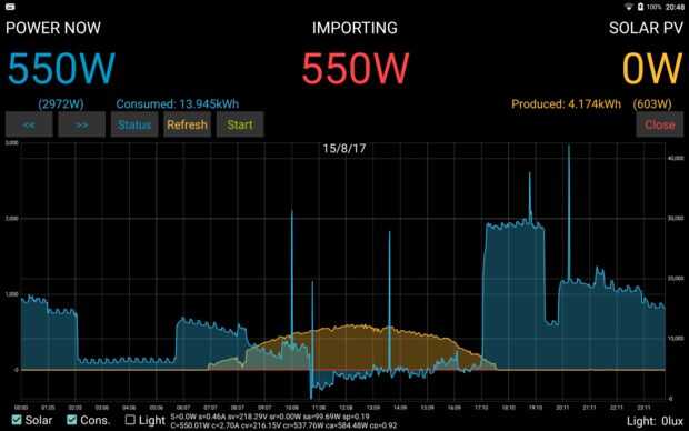 Como tenemos solamente un sistema pequeño de 1kW y estamos en casa durante el día hemos decidido a ajustar nuestro consumo de energía para que no empujamos hacia atrás demasiada energía en la red pública. Pero, ¿cómo saber si el sistema solar está produciendo más energía que estamos consumiendo? El proveedor de los micro inversores ofrece un sistema de monitoreo. Pero el costo es de 10% de lo que pagamos por todo el sistema. ¡Demasiado! Y en la parte superior es un sistema propietario, usando línea comunicación de energía pero el Protocolo no está disponible (una de las cosas que odio en este mundo!). Para monitorear se limitan a utilizar nuestro navegador web y obtener los datos desde el servidor de web de empresas, donde almacena toda la información que reciben de nuestro sistema. Así que empecé a buscar en internet para una solución alternativa para controlar nuestro consumo de energía y producción. El mejor sitio que he encontrado es: OPENENERGYMONITOR.