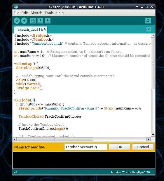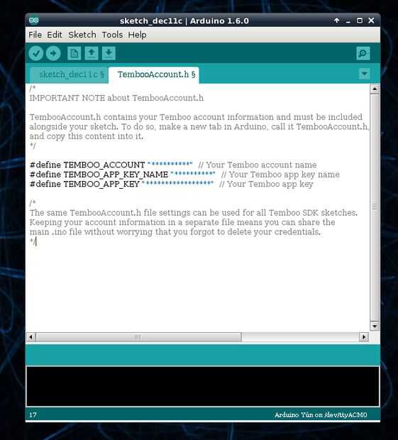 Abra el ide de Arduino y copia y pega el código generado por Temboo.