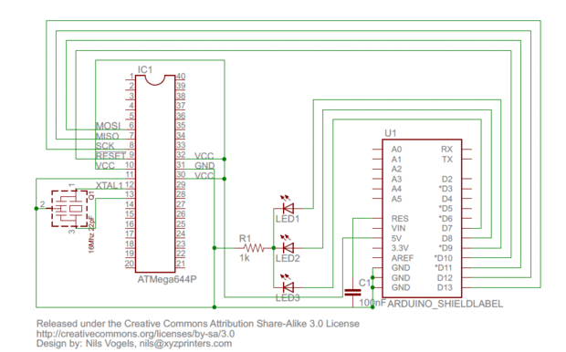 En esquemas, puedes ver los cables arnés de Arduino y sus terminales correspondientes en el Atmega16A.