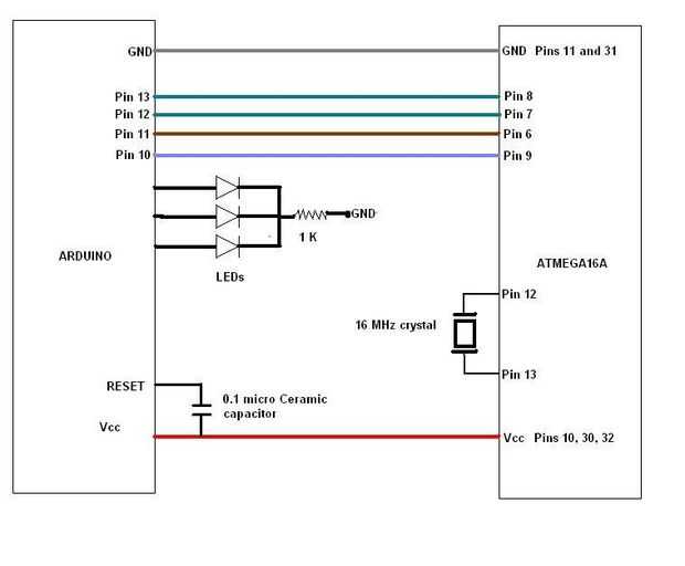 Además, necesita conectar cristal de 16MHz a los pines 12 y 13 de Atmega16A. También conectar pines Vcc y GND a los correspondientes pines del Atmega16 del arnés.