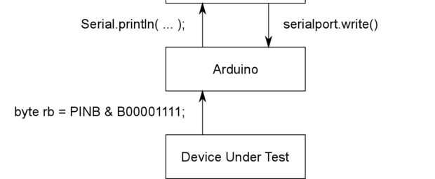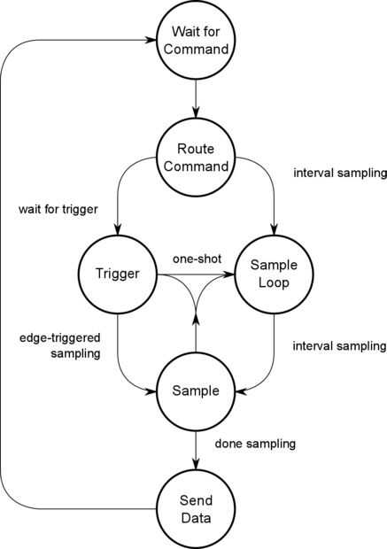 El sketch de Arduino contiene una máquina de estado que escucha los comandos serie a analizar, o inicia una sesión de adquisición de datos. Adquisición de datos se produce en forma de muestreo por flancos o basada en tiempos electorales. Tiempo base-interrogación puede ser trigged por un borde de levantamiento o caído.