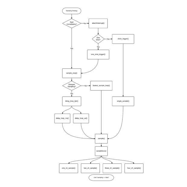 Intento de limitar la sobrecarga, escribí cuatro diferentes rutinas de muestreo basan en el número de canales seleccionados y llaman a un puntero a función en lugar de if/else. Cada rutina tiene sus propias optimizaciones. El controlador de comandos iniciar % establece el puntero de función apropiada.