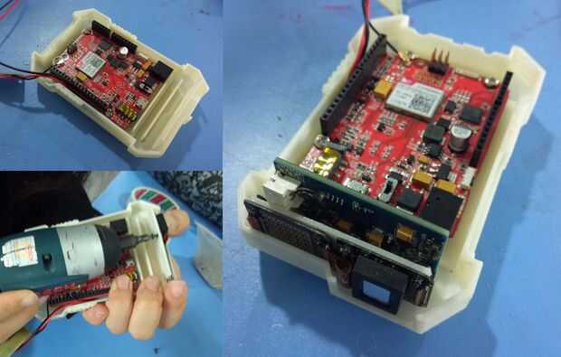 Hay 3 palces de fijar en la parte posterior de la concha inferior, su diámetro es de 3mm y el espesor es de 1mm. Fijar Seeeduino GPRS en la parte posterior de la carcasa superior con 3 tornillos.