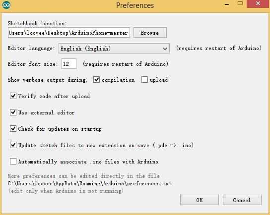 4. Abra el IDE de Arduino, haga clic archivo > Preferencias > Ubicación de carpeta de bocetos, busque la carpeta que habíamos mencionado arriba - ArduinoPhone-master. Haga clic en Aceptar para guardarlo.