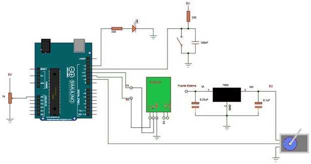 Las conexiones se deben interruptor de para realizar, del módulo Bluetooth, el LED, el potenciómetro y el Arduino UNO, aparecen detalladas en la imagen del paso "Completo del Circuito".