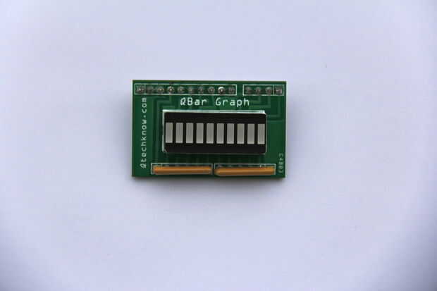 Para usar el gráfico QBar, enchufe en los pines que se suelda en y también conectar el bote de ArduSensor.  Abrir QBarGraph.ino (incluido en la carpeta de código de ejemplo) y cargarlo en el Arduino.  Este bosquejo lee el valor del potenciómetro y enciende el LED en consecuencia.  En otras palabras, cuando se gire el potenciómetro, el LED se iluminará dependiendo de cuánto usted retorcido.
