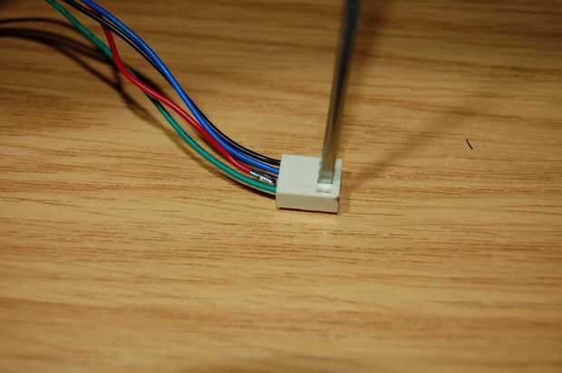 A continuación, retire el conector de 4 pines de los cables y tomar nota del orden de los cables. No utilizar la imagen de arriba, grabarlo a ti mismo como estos motores baratos son raramente los mismos. Puede quitar cada uno de los cables presionando sobre ellos con un pequeño destornillador de cabeza plana.