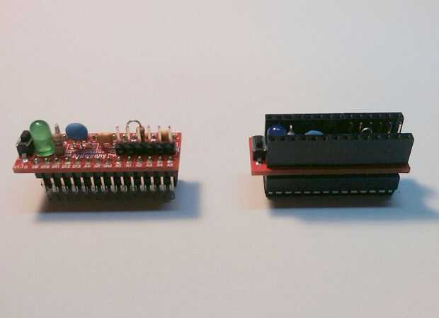 El concepto es simple: revertir la tarjeta de circuito impreso y soldar los componentes en el lado opuesto, así una toma de corriente para el ATmega328can se añade junto con algunos encabezados de tira para la flexibilidad.