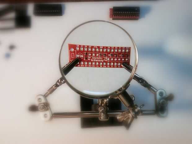 De aquí en sólo tienes que seguir las instrucciones que vienen con el Ardweeny excepto que usted necesita para instalar el componente en el lado opuesto de la placa PC pequeño , el uno sin el blanco etiquetas y tómese su tiempo para asegurarse de que instala los componentes en el correspondiente asignado agujeros.