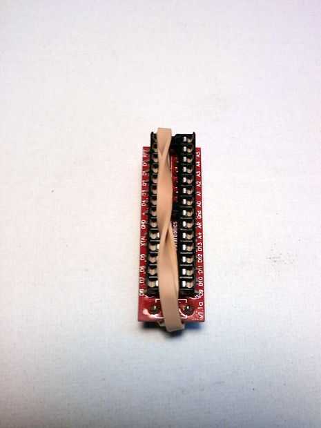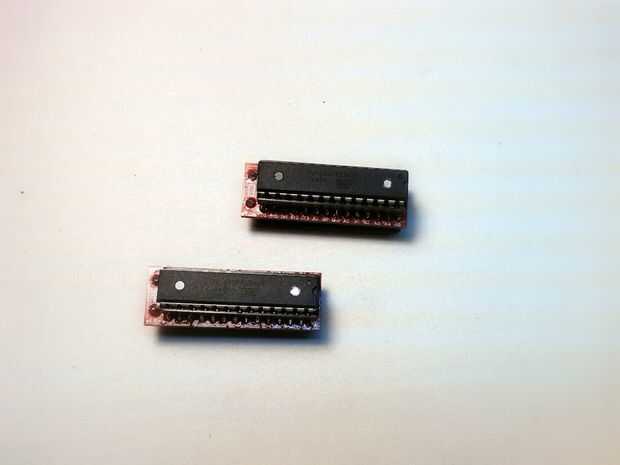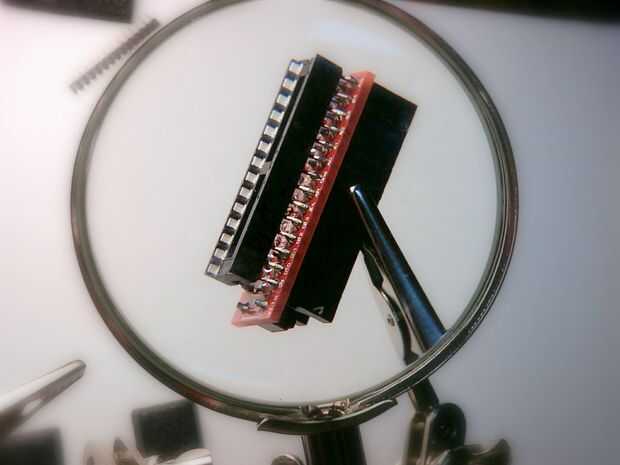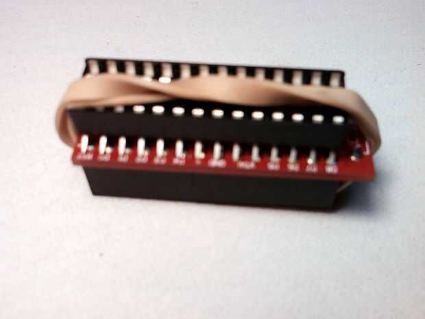 Los 28 pines Pin DIP Socket es necesario doblarse ligeramente. Lo hice usando el borde de una mesa y suavemente hacia el exterior a unos 45 grados. Tómese su tiempo, poco a poco aumentando el ángulo hasta que alinean los pines doblados en anchura con el ancho del encabezado en el tablero de PC.