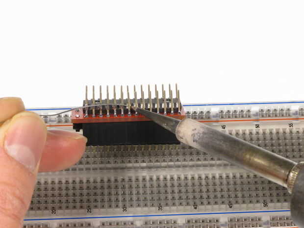 De nuevo, utilice la técnica de soldadura "solo-perno": después de soldar la primera pata del chip, asegúrese de que el chip esté correctamente en su lugar a ambos lados. ¿Todo se ve bien? Excelente - acabado de soldadura, utilizando como soldadura poco como usted puede. Demasiada soldadura puede blob hacia abajo de los pernos y hacerla difícil de usar con un protoboard!