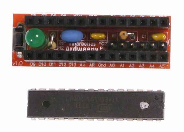 Mira de cerca en el chip Atmel - tiene una pequeña muesca o hendidura en uno de los extremos estrechos. El pcb de Ardweeny tiene una línea similar en el extremo del PCB (el lado opuesto al botón). Compruebe hacia fuera la imagen de abajo para confirmar que tiene derecho!