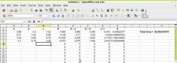 Todo lo que tienes que hacer es añadir en los valores de a, b y c para cada triángulo y se le calcula áreas y le dará un total.