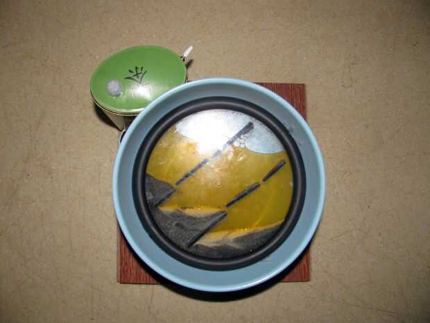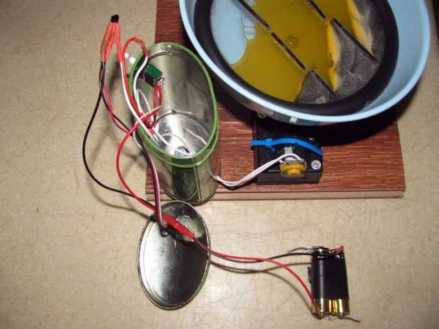 Primera foto muestra la máquina. El marco de arte con arena se encuentra dentro de un cuenco que se une a un rodamiento y polea conectada a un motor. En el té verde lata es el interruptor de encendido/apagado y el PIR que el motor se enciende cada vez que alguien llega.