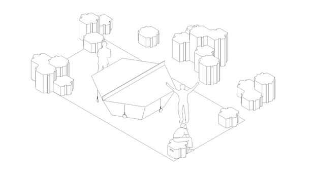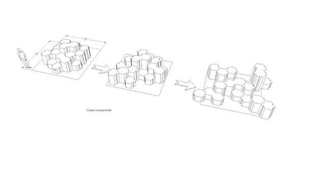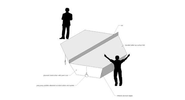 El equipo finalmente filtrada a través de estos dibujos y colocado en (2) conceptos principales de participación activa (juego) y pasiva (ARENA). Dada la limitación de espacio del festival y la idea de que la instalación sea identificable/accesible, nos centramos en tenis de mesa como actividad. El equipo comenzó a formalizar la forma de la propuesta "arena" elemento de asiento, empezamos mirando formas que podrían ser un módulo repetido fácilmente. Después de colocar en el módulo de hexágono, nos dimos cuenta había oportunidad de modificar el concepto de "juego" tenis de mesa y crear un nuevo tipo de elemento de juego. Cambiando la forma de la tabla, se identificó la posibilidad de que la tabla podría crear el contrato aleatorio en el espacio público - obligando a más de 2 personas a interactuar y también forzando a los jugadores crear sus propias reglas.